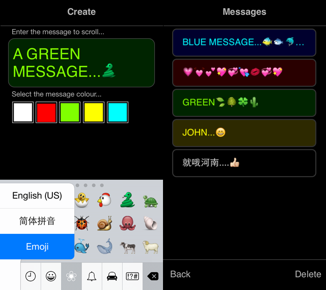 In the image below you can see two cards… they are from the same stack.. The card on the left has a UITextView Control and into it I can add text, change its color and add emoticons… Everything works fine, I can save the messages to a file and get them out again…