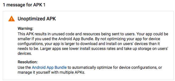 Now, Without using the App Bundle feature, you can't even publish a new app to Google Play. I got the warning message below during the uploading process. The "Next" button is disabled except for an optimized apk. It seems that there are no other choices available. I hope this issue get fixed ASAP.