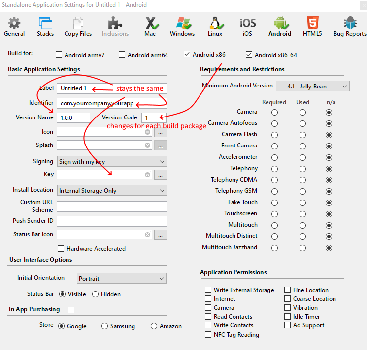 1. Do three APKs have an identical Identifier, Version name but different version code in the standalone settings?So armv7 will be 1