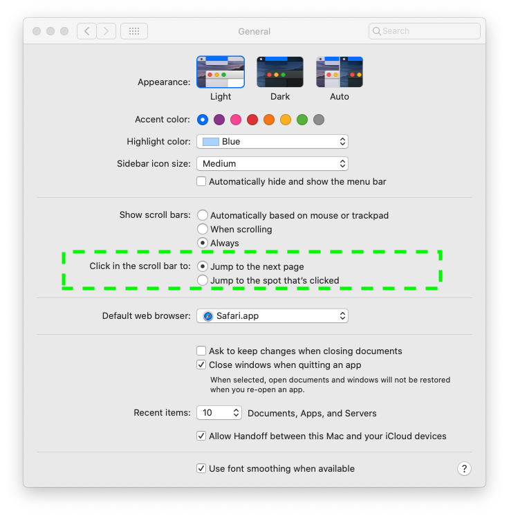 Is there a way to have LiveCode on MacOS honor the scrollbar behavior preference in the General preferences? In particular, the preference choices are "Jump to the next page" and "Jump to the spot that's clicked".