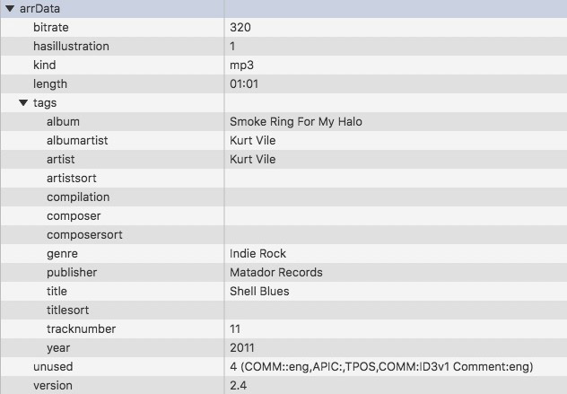[{"tags": [{"tracknumber": "11"},{"title": "Shell Blues"},{"artist": "Kurt Vile"},{"album": "Smoke Ring For My Halo"},{"year": "2011"},{"composer": ""},{"genre": "Indie Rock"},{"albumartist": "Kurt Vile"},{"compilation": "1"},{"titlesort": ""},{"albumsort": ""},{"albumartistsort": ""},{"artistsort": ""},{"composersort": ""},{"publisher": "Matador Records"}]},{"kind": "mp3"},{"version": "2.4"},{"length": "01:01"},{"bitrate": "320"},{"hasillustration": "1"},{"unused": "-1"}]