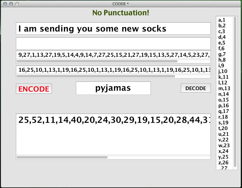 The ENCODE button has MY code in it [the children did NOT get that], but the DECODE button is empty at the moment.